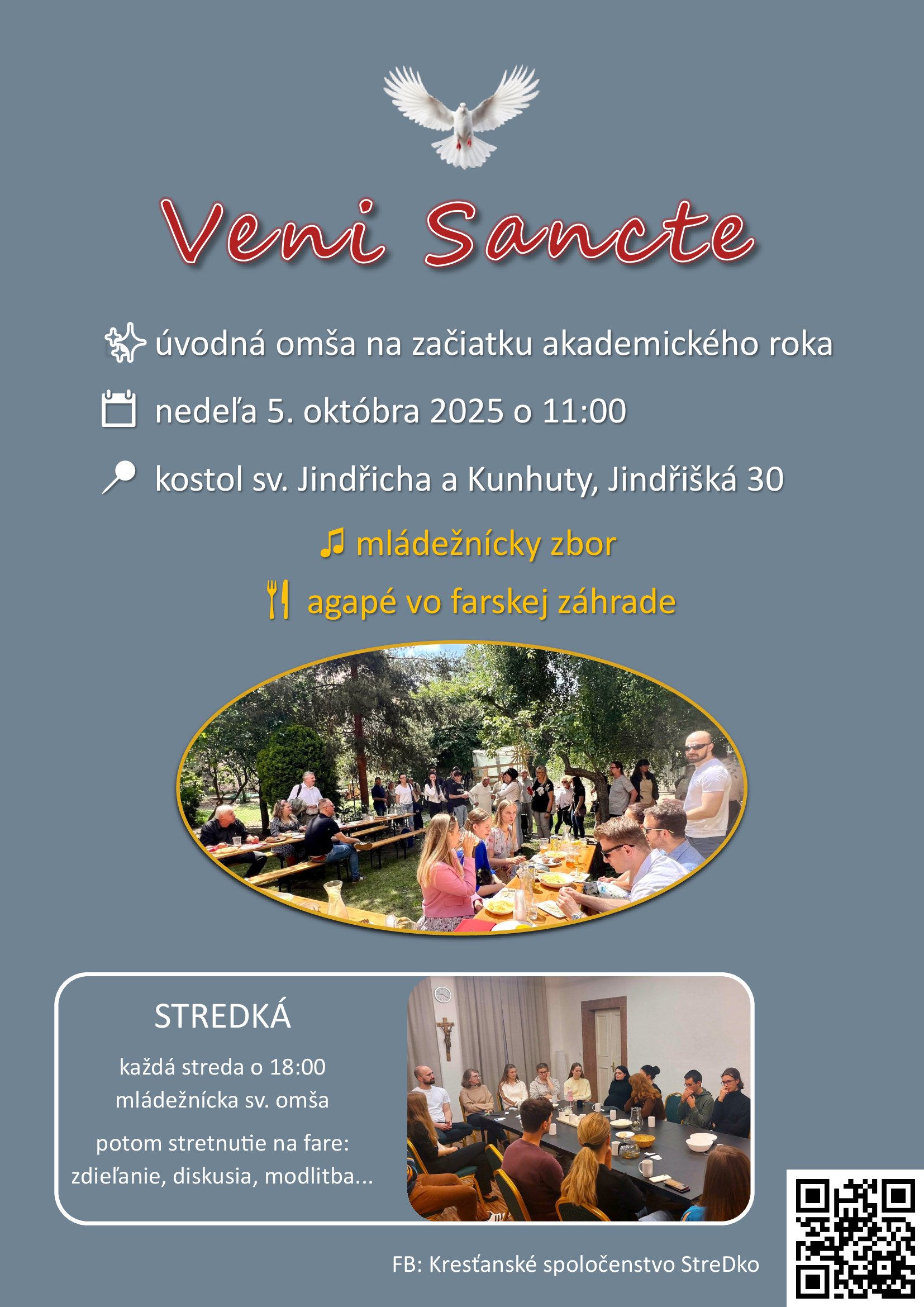 Mládežnícke spoločenstvo (StreDko) pri Slovenskej rímskokatolíckej farnosti v Prahe pozýva na streká každú stredu: o 18:00 sv. omša a po omši (18:45) stretnutie v pastoračnom centre.